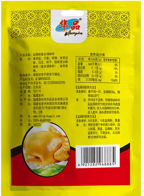 鹽焗雞使用方法 準備食材:童子雞一只,鹽焗粉30g,植物油2湯勺 做法:將雞洗干瀝凈,把植物油和華品鹽焗粉均勻地涂抹在雞表面和腹內,放入冰箱腌制30分鐘。裝入盤中,隔水蒸熟即可食用。 鹽焗蝦使用方法 準備食材:500克蝦,15克鹽焗粉,蔥姜 做法:將蝦處理干凈后倒入鍋中,加入料酒,蔥姜,鹽焗粉,充分搖晃均勻,不需加水,大火燜煮3分鐘即可出鍋。