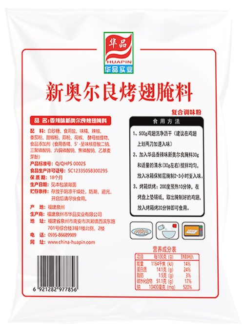 1、500g雞翅洗凈瀝干(建議在雞翅上劃兩刀加速入味) 2、加入華品香辣味新奧爾良腌料30g 和適量的清水(30g左右)攪拌均勻,放入冰箱保鮮層腌制2-3小時至入味。 3、烤箱烘烤:200度預熱10分鐘,在烤盤上墊錫紙,取出腌制好的雞翅,放入烤箱烤20分鐘即可食用。
